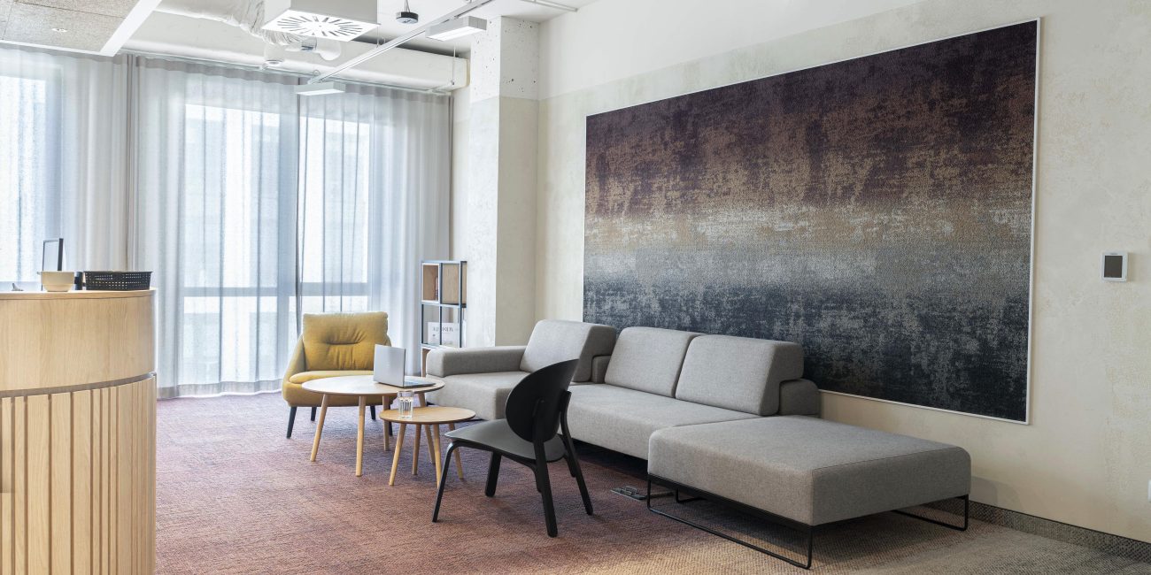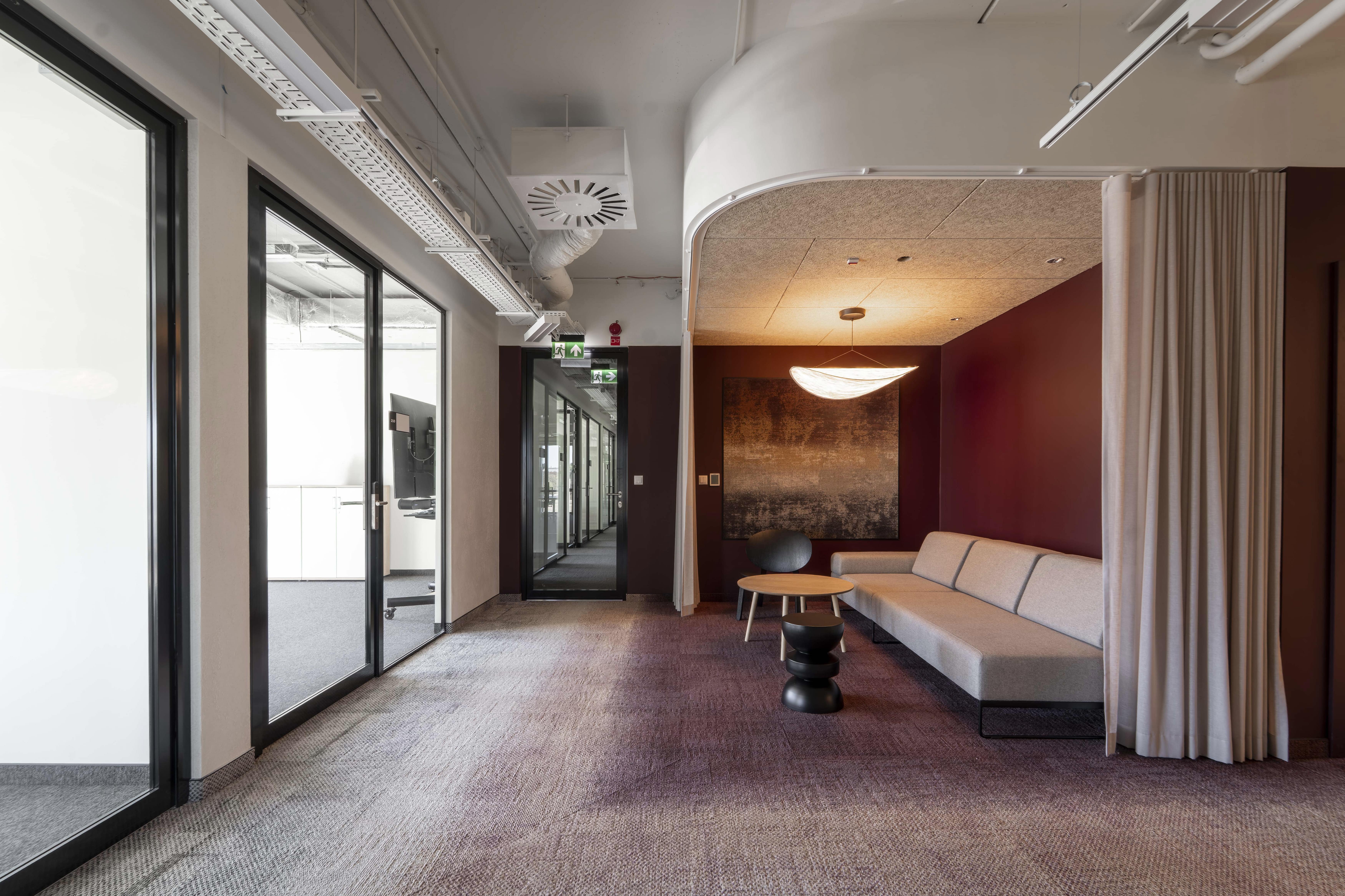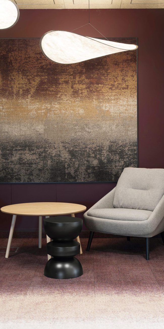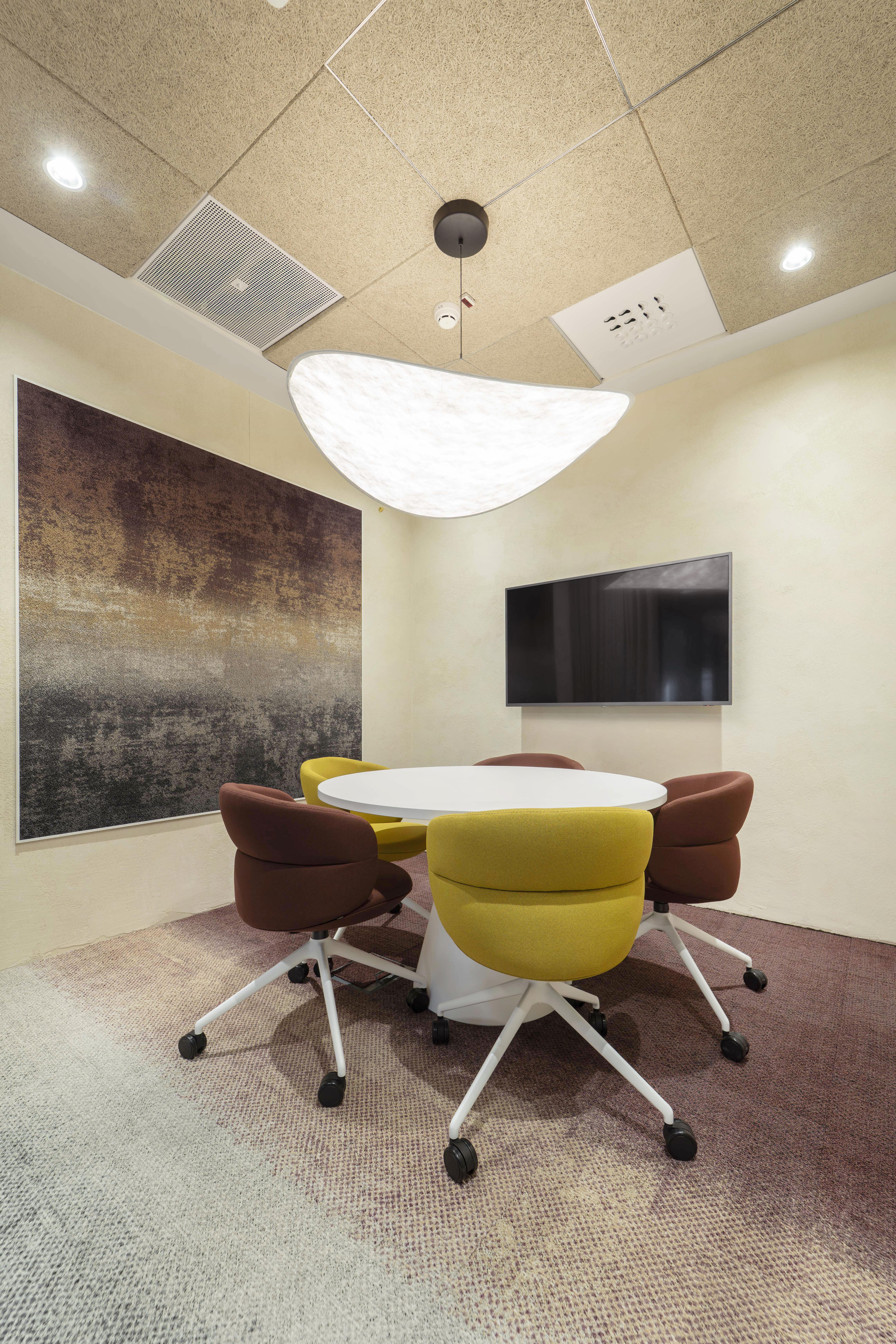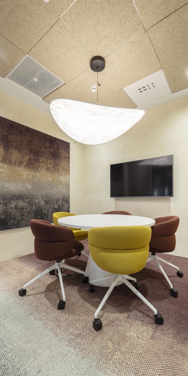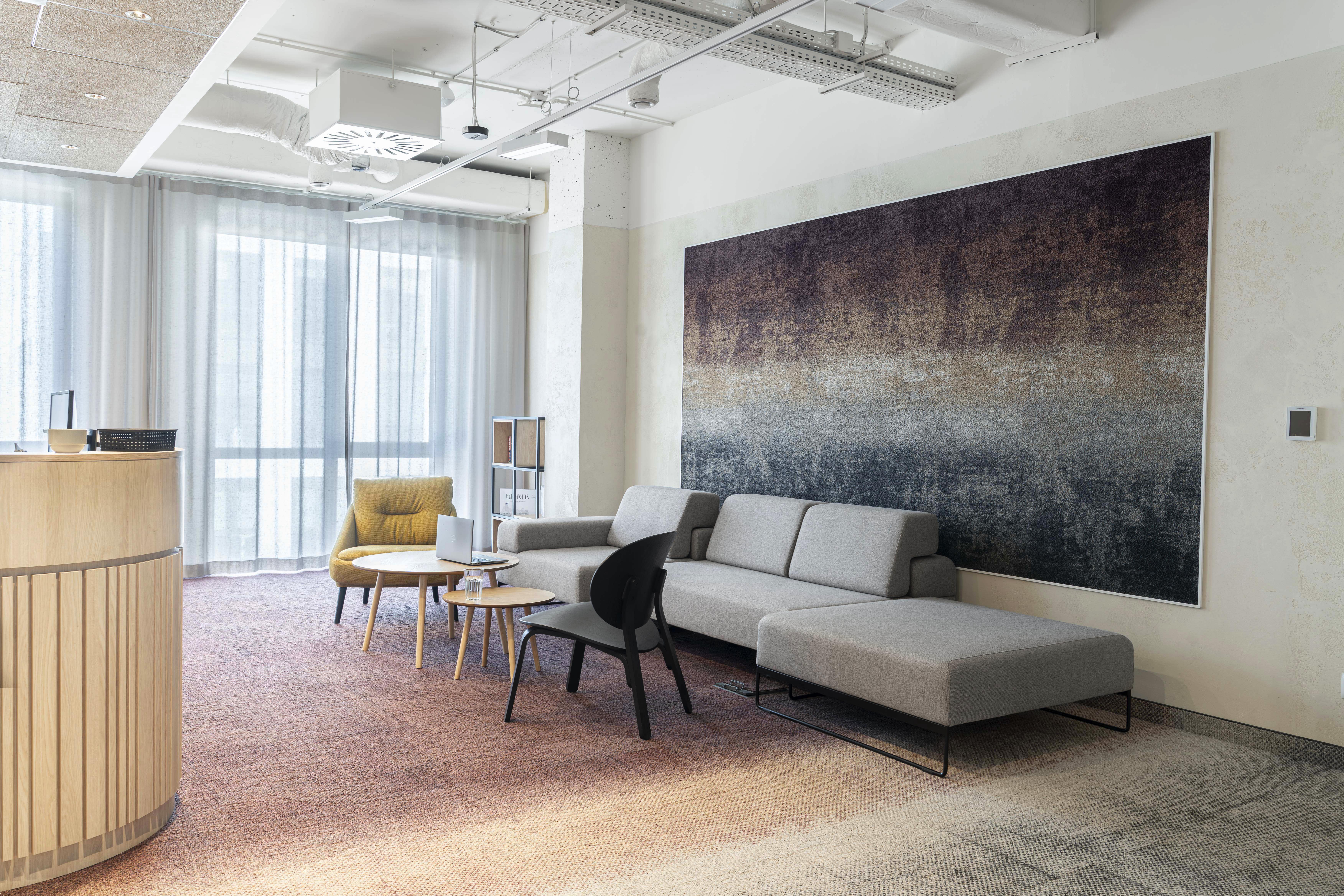 Projekt Forum ma charakterystyczną dla naszych realizacji łagodność i przytulność. Wnętrza operują miękkim światłem, przyjemnymi teksturami i ciepłymi barwami zachodzącego słońca. Kolorystyka i światło wspierają koncentrację, redukują stres i poprawiają komfort pracy. W centrum stworzyliśmy słoneczną, kompaktową strefę – na co dzień służy jak wewnętrzna kawiarnia i miejsce do nieformalnych spotkań, wieczorami może przeistaczać się w przestrzeń eventową. Jedną z charakterystycznych dekoracji stały się oprawione w ramy dywanowe obrazy, zaprojektowane specjalnie dla tego wnętrza wraz z Ege Carpets – powtarzają motywy gradientowe ze ścian i poprawiają akustykę sal konferencyjnych.