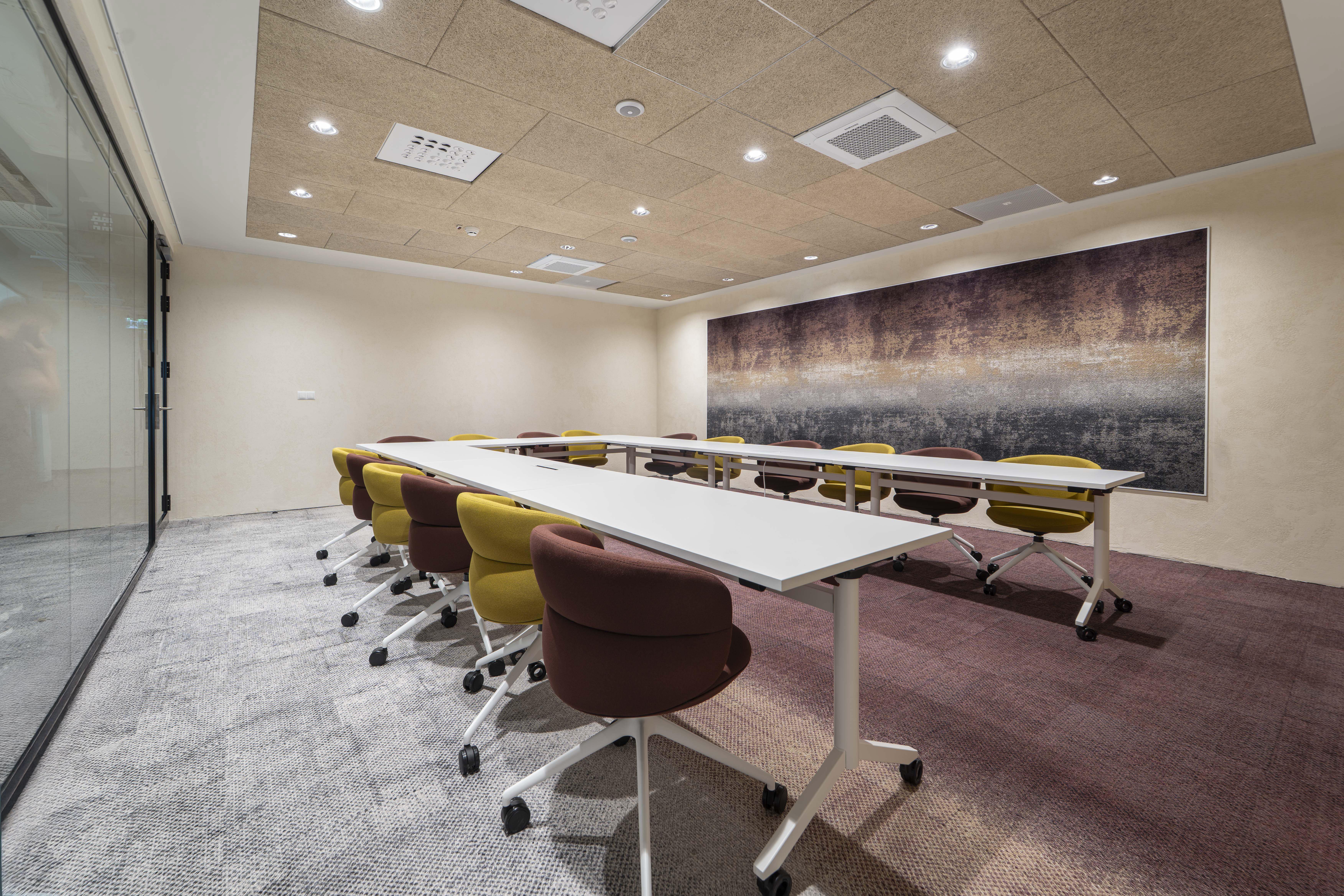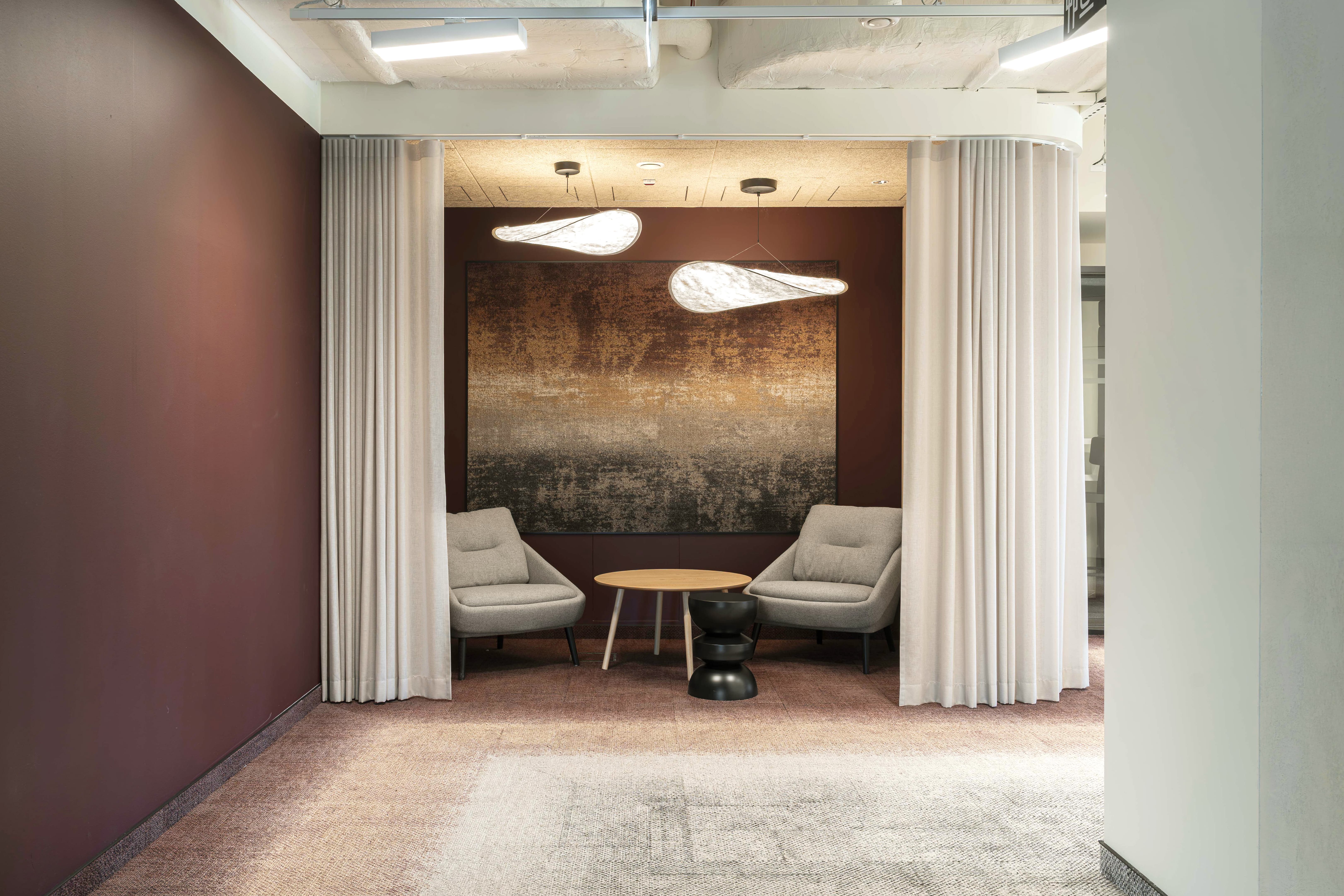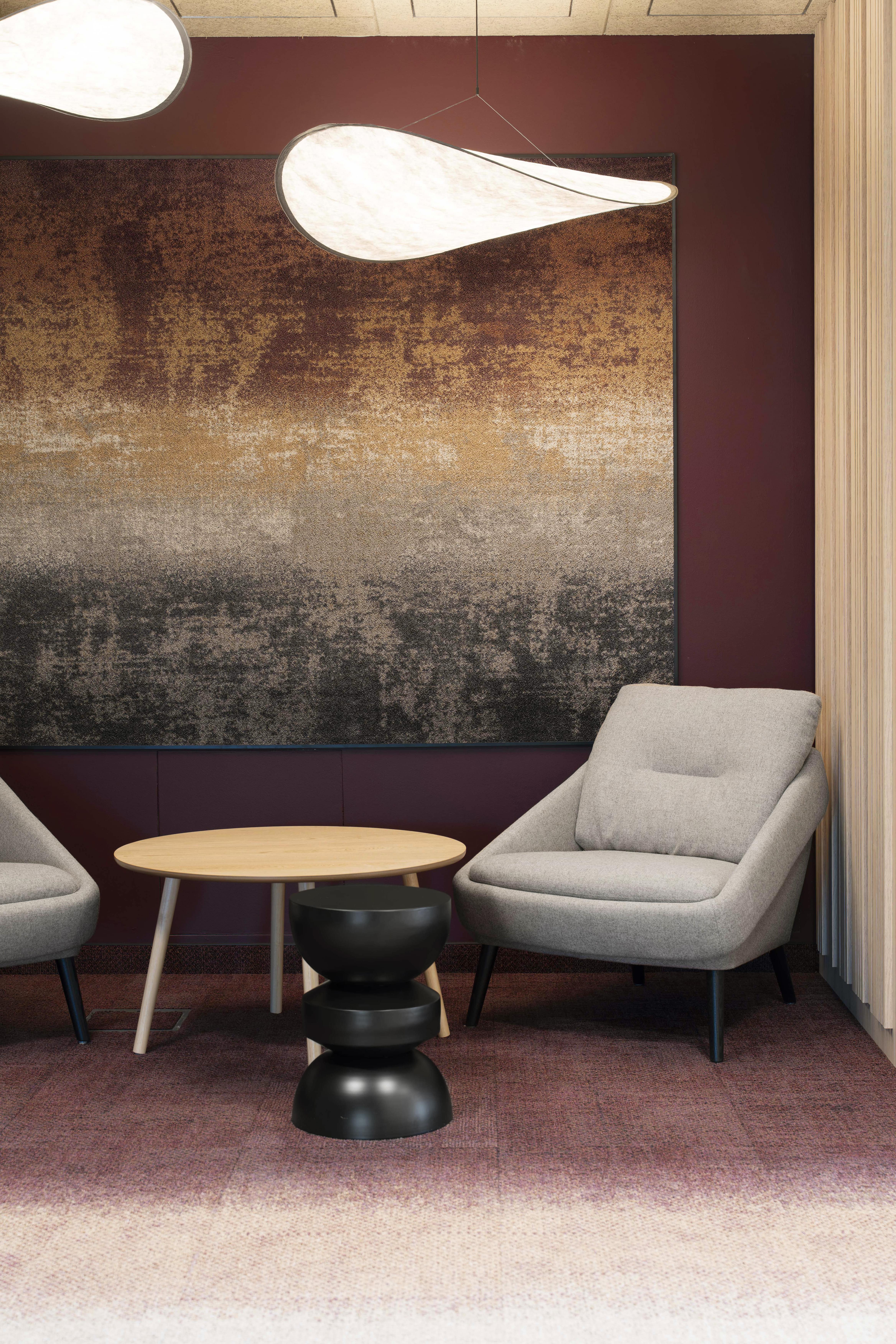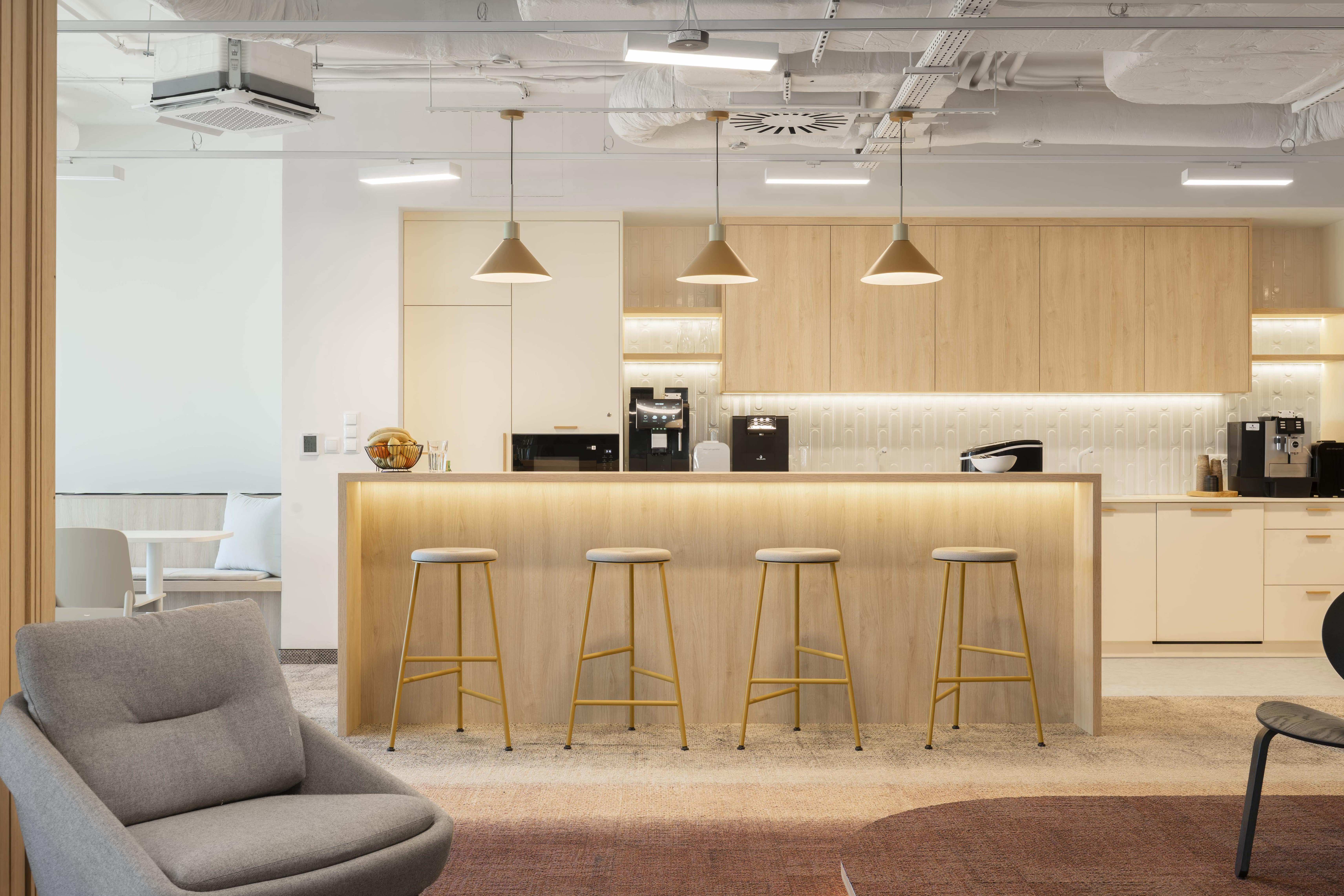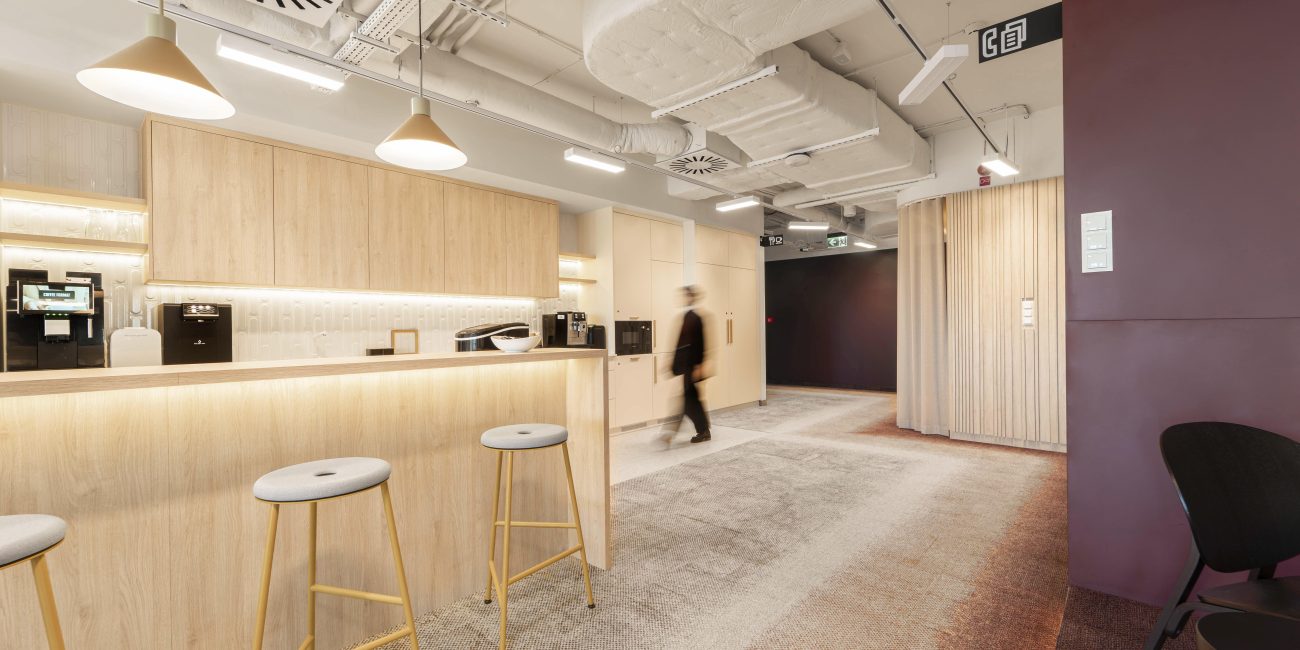 Projekt Forum ma charakterystyczną dla naszych realizacji łagodność i przytulność. Wnętrza operują miękkim światłem, przyjemnymi teksturami i ciepłymi barwami zachodzącego słońca. Kolorystyka i światło wspierają koncentrację, redukują stres i poprawiają komfort pracy. W centrum stworzyliśmy słoneczną, kompaktową strefę – na co dzień służy jak wewnętrzna kawiarnia i miejsce do nieformalnych spotkań, wieczorami może przeistaczać się w przestrzeń eventową. Jedną z charakterystycznych dekoracji stały się oprawione w ramy dywanowe obrazy, zaprojektowane specjalnie dla tego wnętrza wraz z Ege Carpets – powtarzają motywy gradientowe ze ścian i poprawiają akustykę sal konferencyjnych.