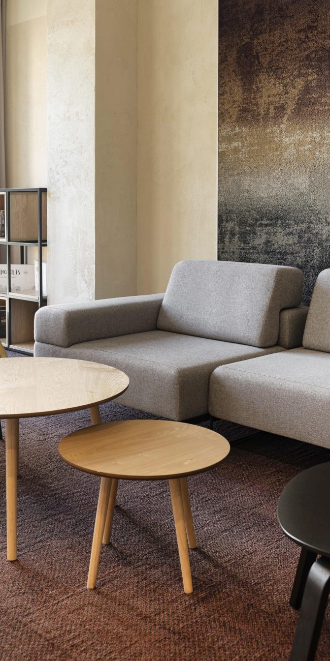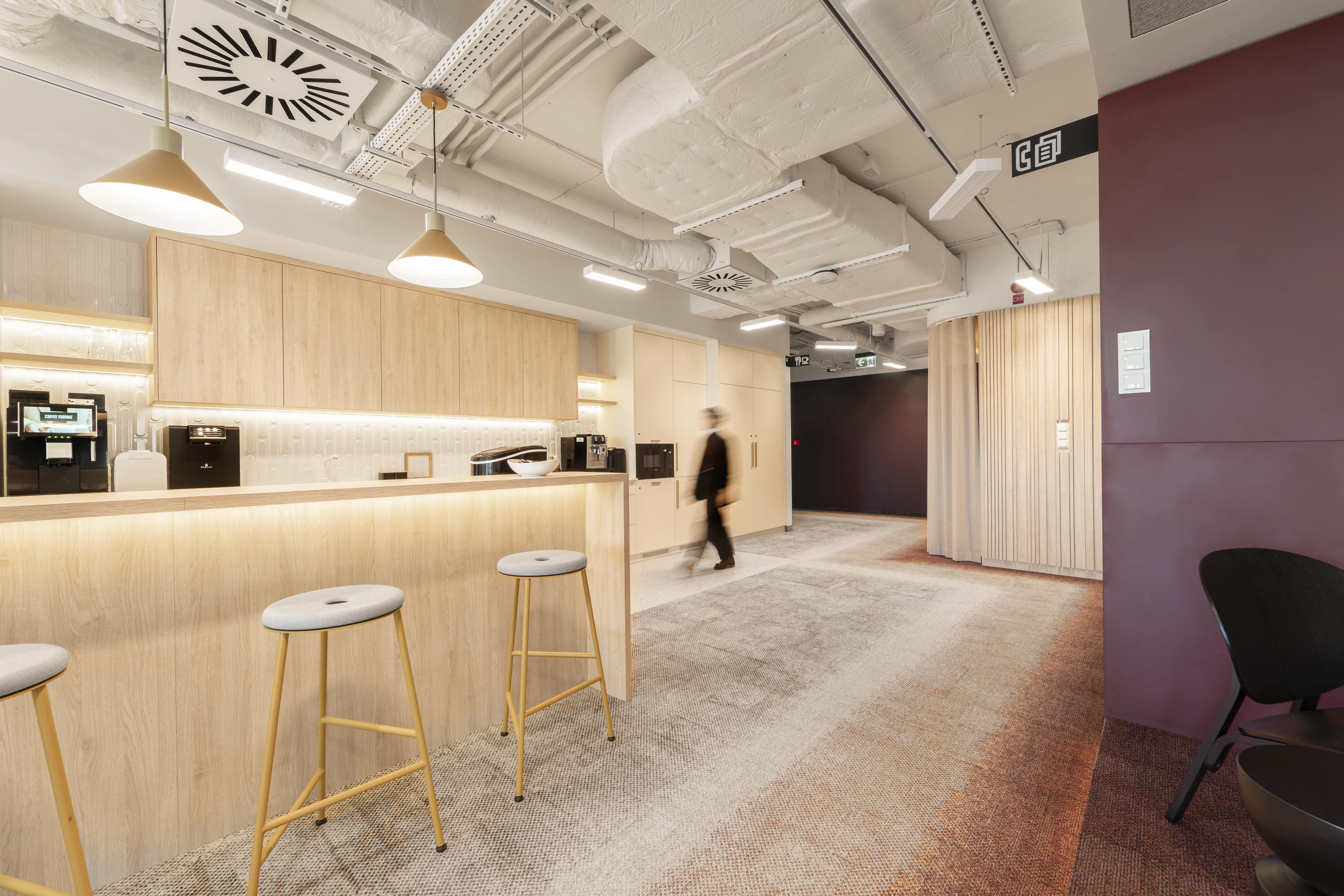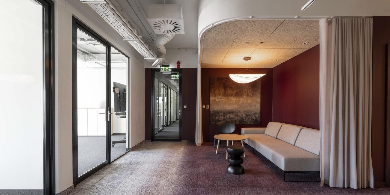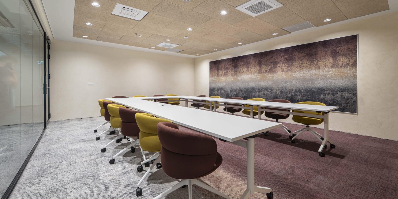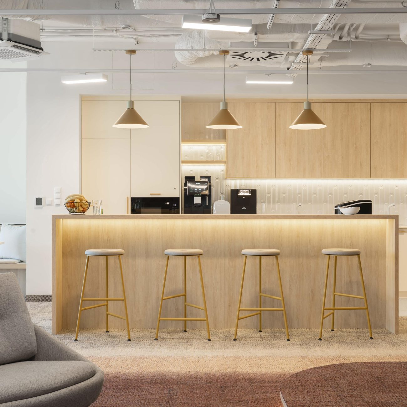 Projekt Forum ma charakterystyczną dla naszych realizacji łagodność i przytulność. Wnętrza operują miękkim światłem, przyjemnymi teksturami i ciepłymi barwami zachodzącego słońca. Kolorystyka i światło wspierają koncentrację, redukują stres i poprawiają komfort pracy. W centrum stworzyliśmy słoneczną, kompaktową strefę – na co dzień służy jak wewnętrzna kawiarnia i miejsce do nieformalnych spotkań, wieczorami może przeistaczać się w przestrzeń eventową. Jedną z charakterystycznych dekoracji stały się oprawione w ramy dywanowe obrazy, zaprojektowane specjalnie dla tego wnętrza wraz z Ege Carpets – powtarzają motywy gradientowe ze ścian i poprawiają akustykę sal konferencyjnych.