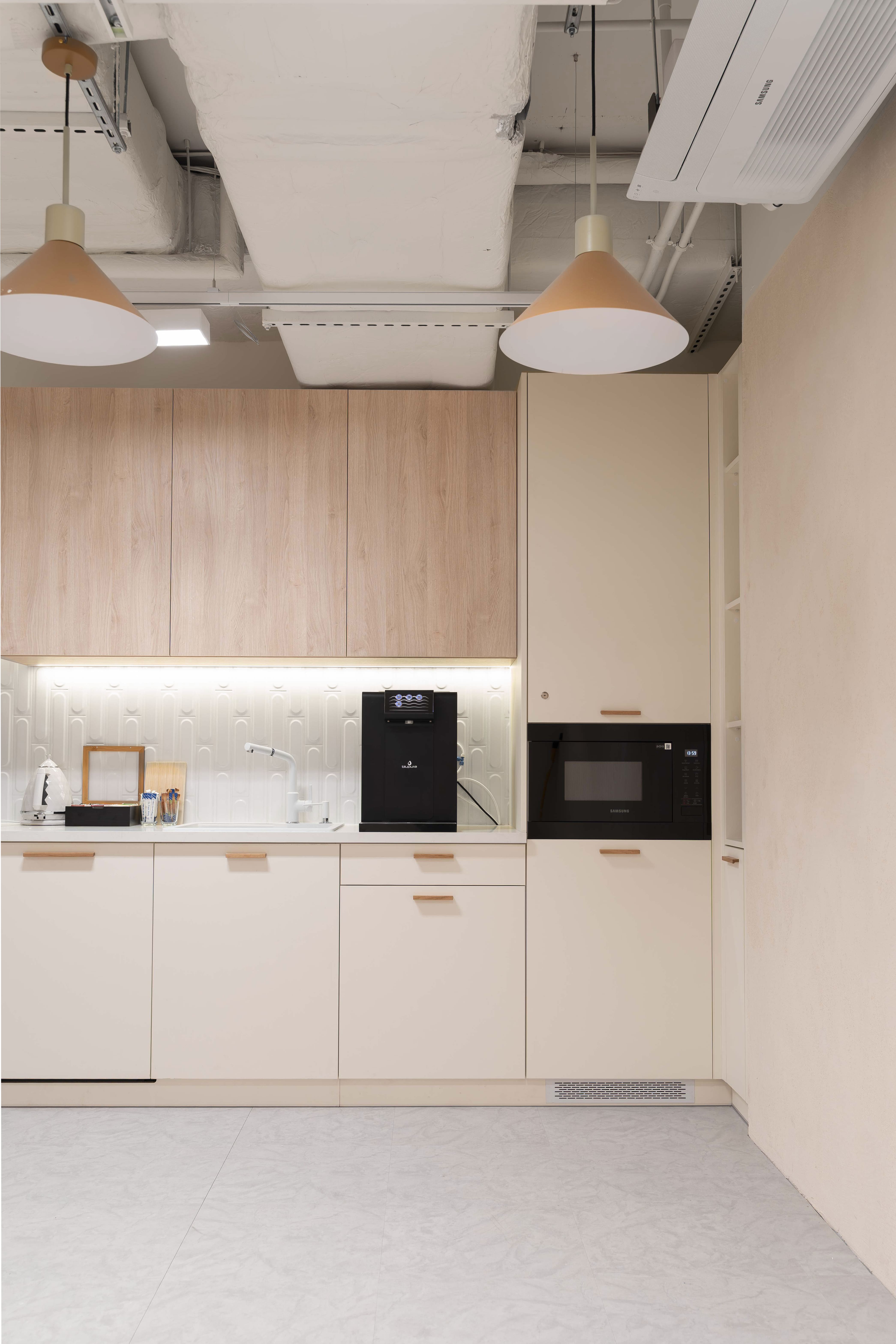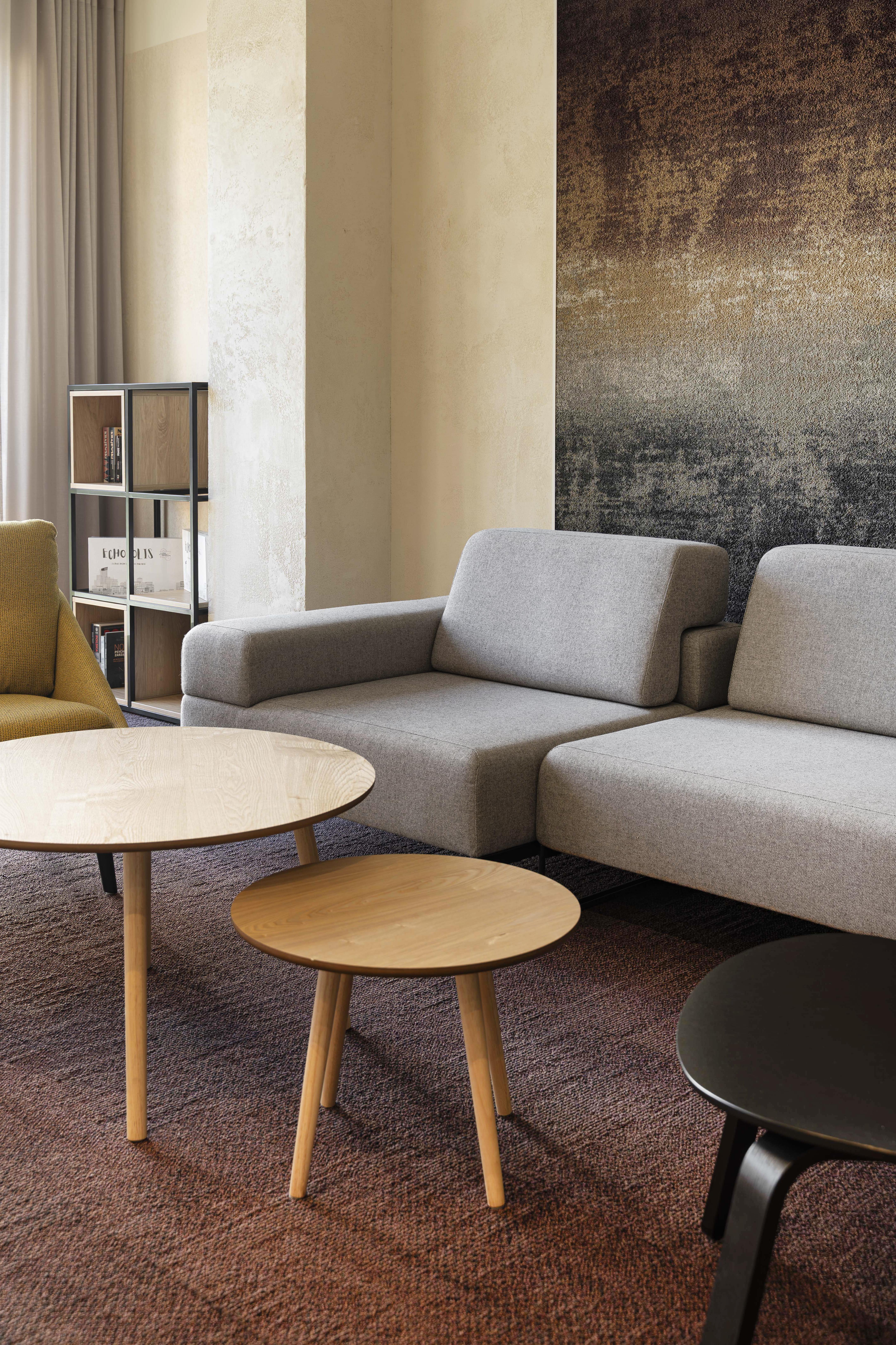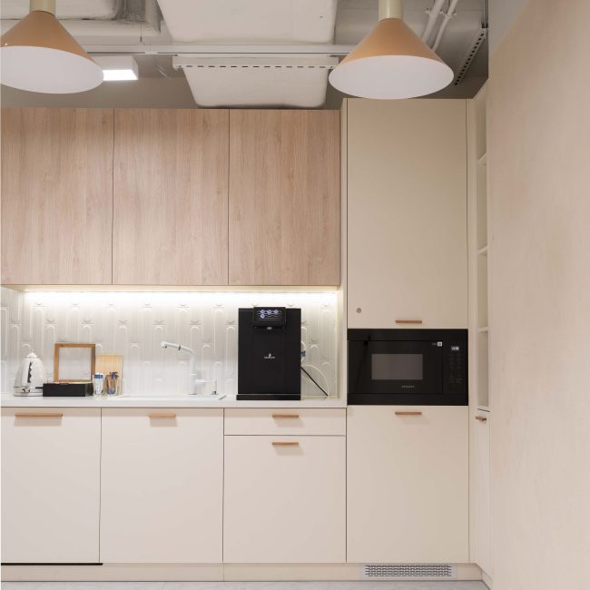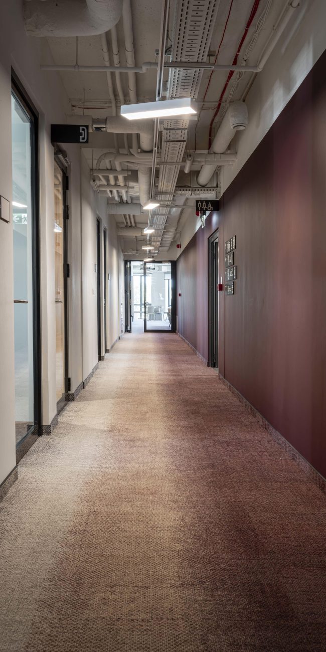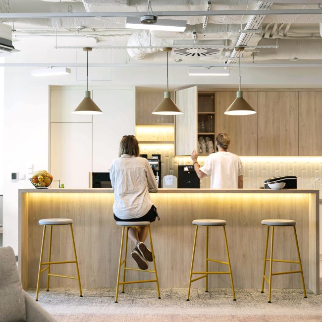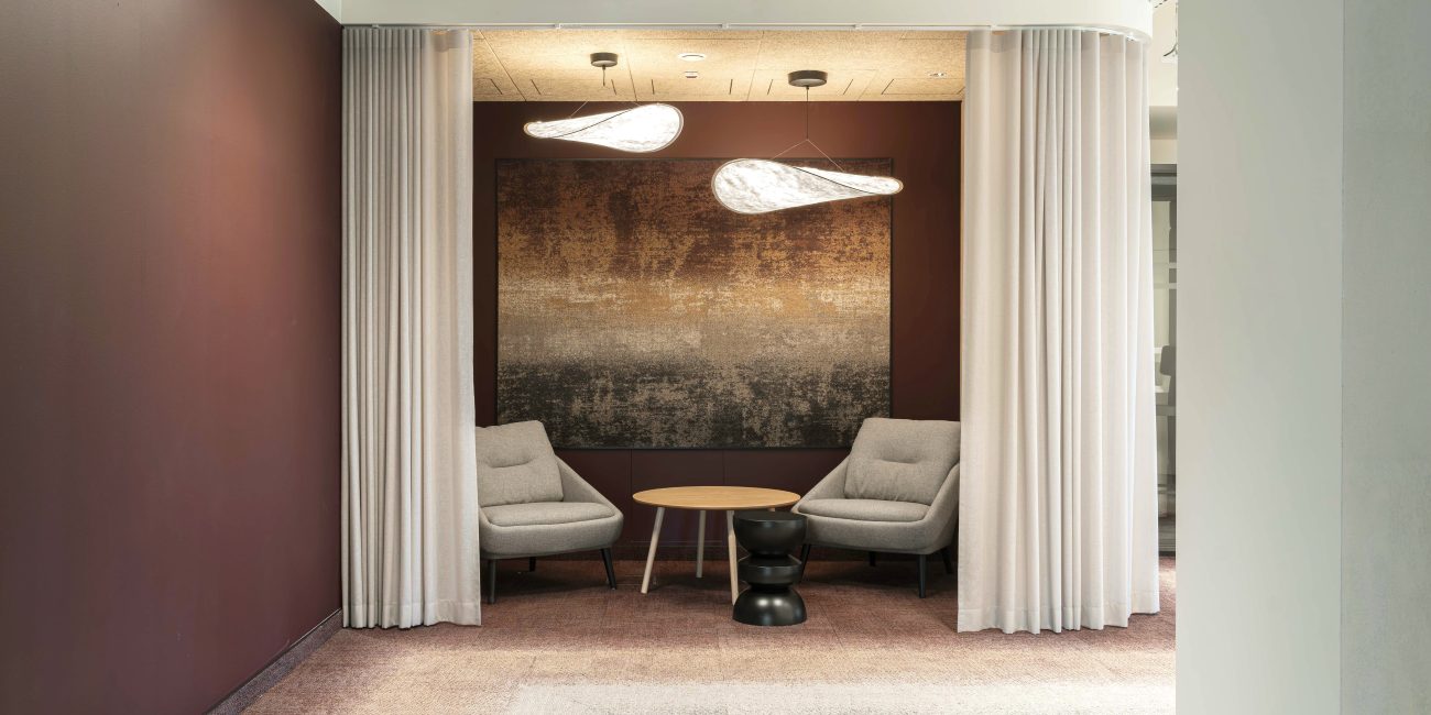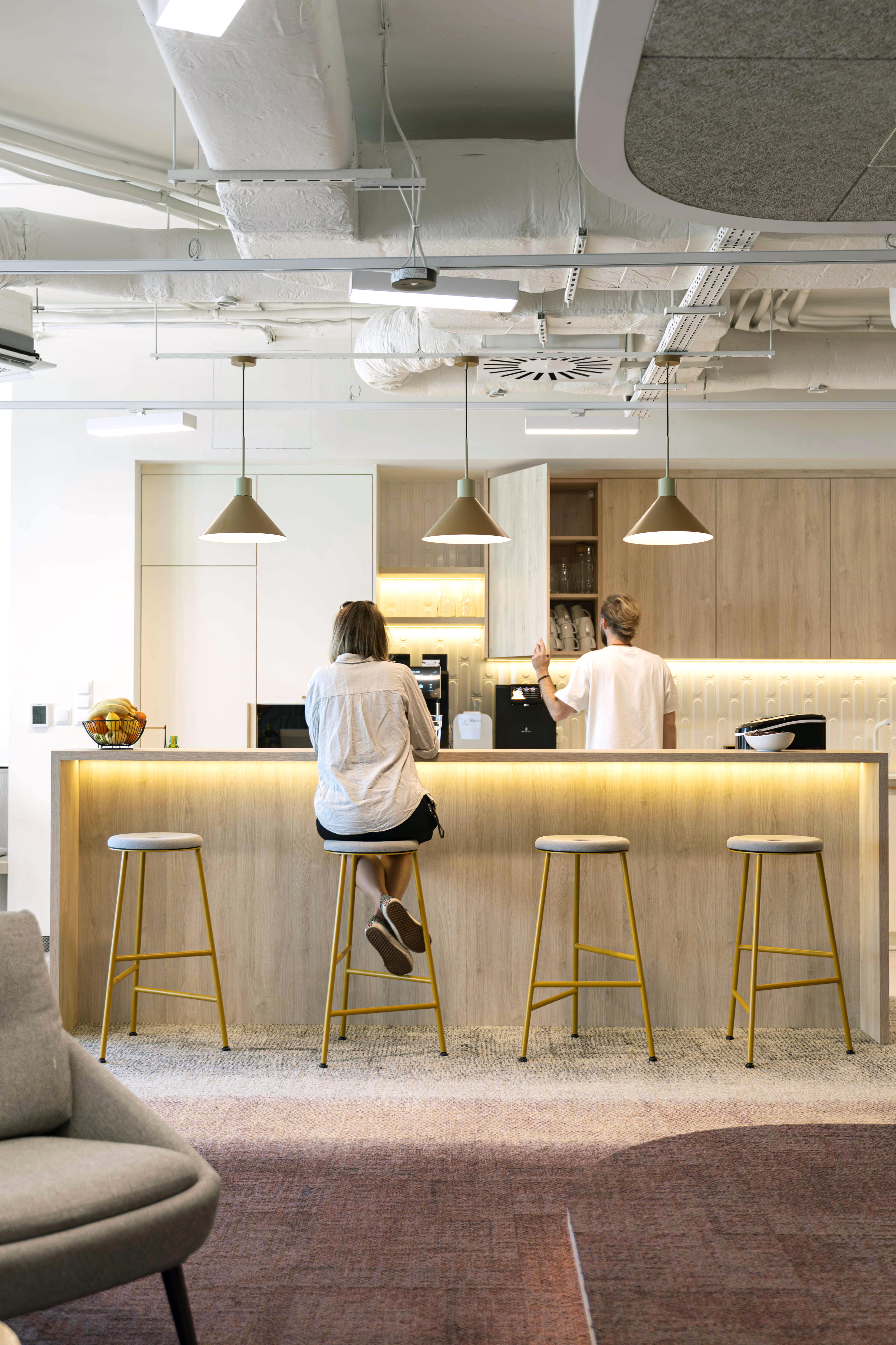 Projekt Forum ma charakterystyczną dla naszych realizacji łagodność i przytulność. Wnętrza operują miękkim światłem, przyjemnymi teksturami i ciepłymi barwami zachodzącego słońca. Kolorystyka i światło wspierają koncentrację, redukują stres i poprawiają komfort pracy. W centrum stworzyliśmy słoneczną, kompaktową strefę – na co dzień służy jak wewnętrzna kawiarnia i miejsce do nieformalnych spotkań, wieczorami może przeistaczać się w przestrzeń eventową. Jedną z charakterystycznych dekoracji stały się oprawione w ramy dywanowe obrazy, zaprojektowane specjalnie dla tego wnętrza wraz z Ege Carpets – powtarzają motywy gradientowe ze ścian i poprawiają akustykę sal konferencyjnych.