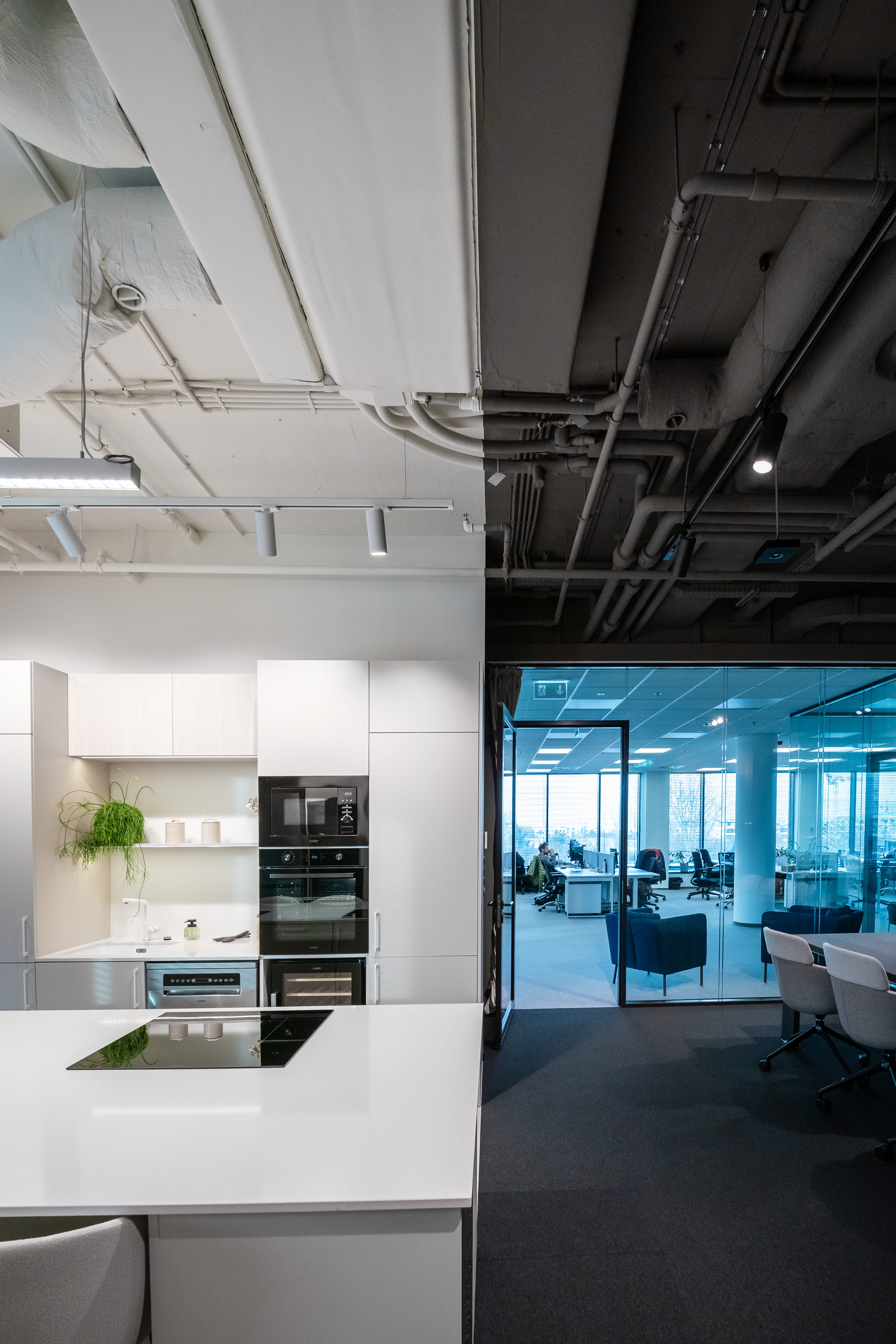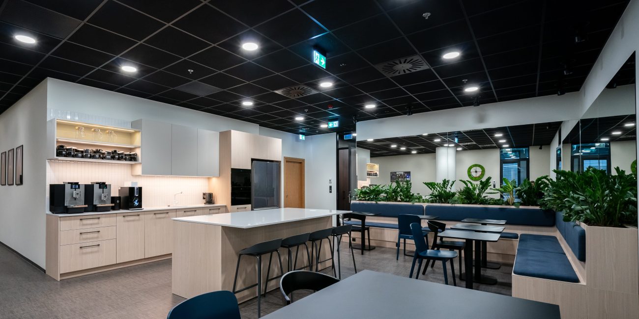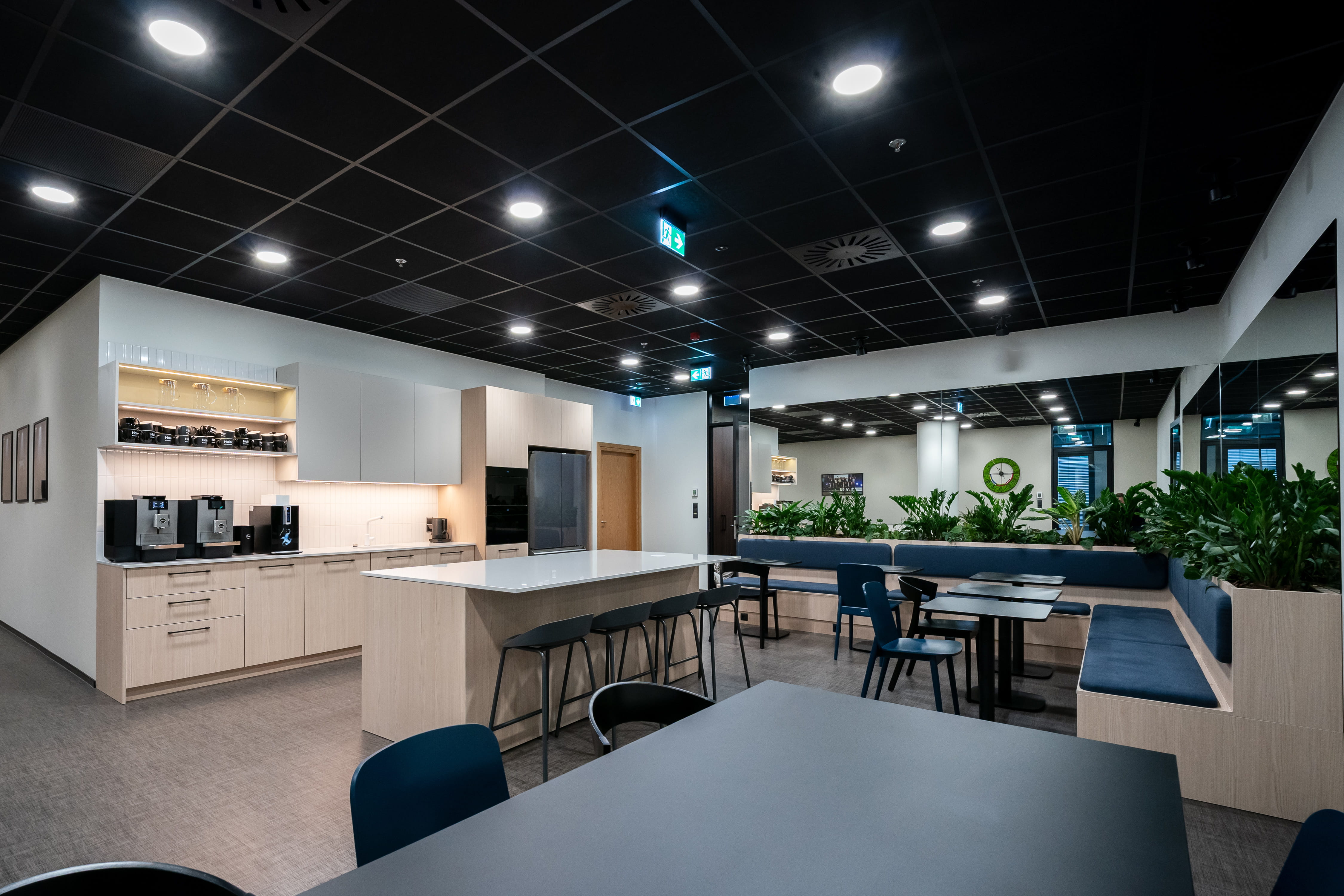 At the heart of the office, we placed a spacious staff kitchen connected to a relaxation zone. With dedicated irrigation and lighting systems, this space became home to an impressive collection of living plants.