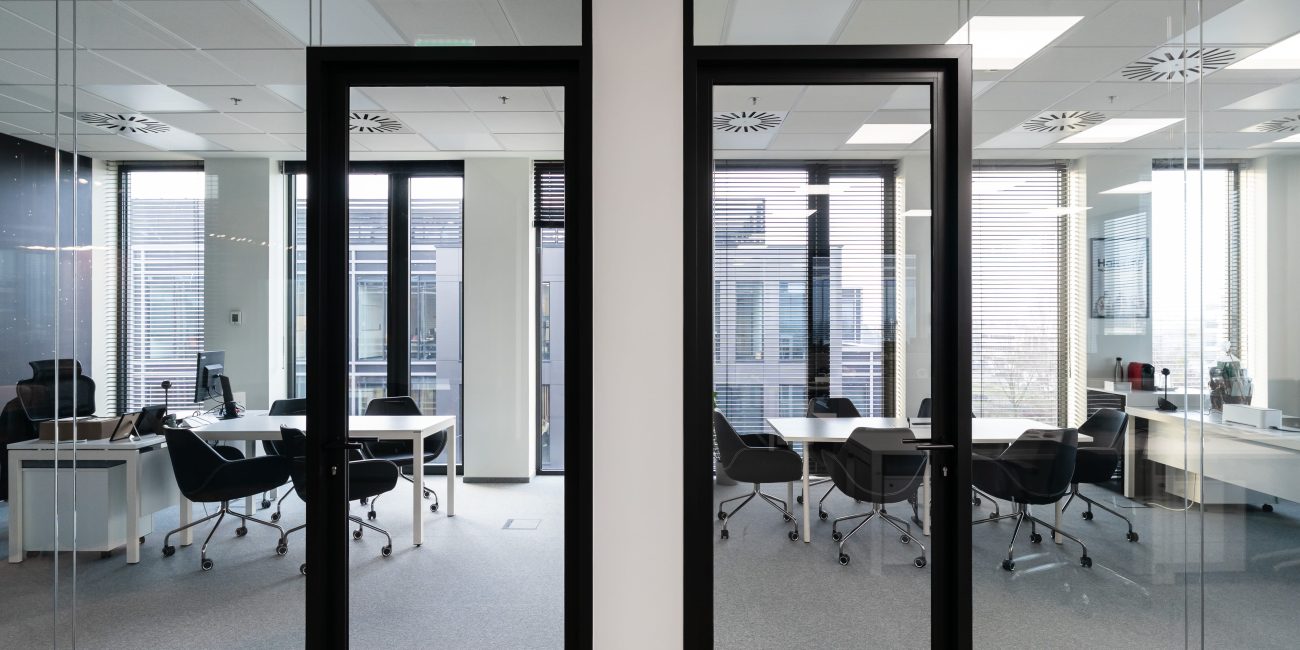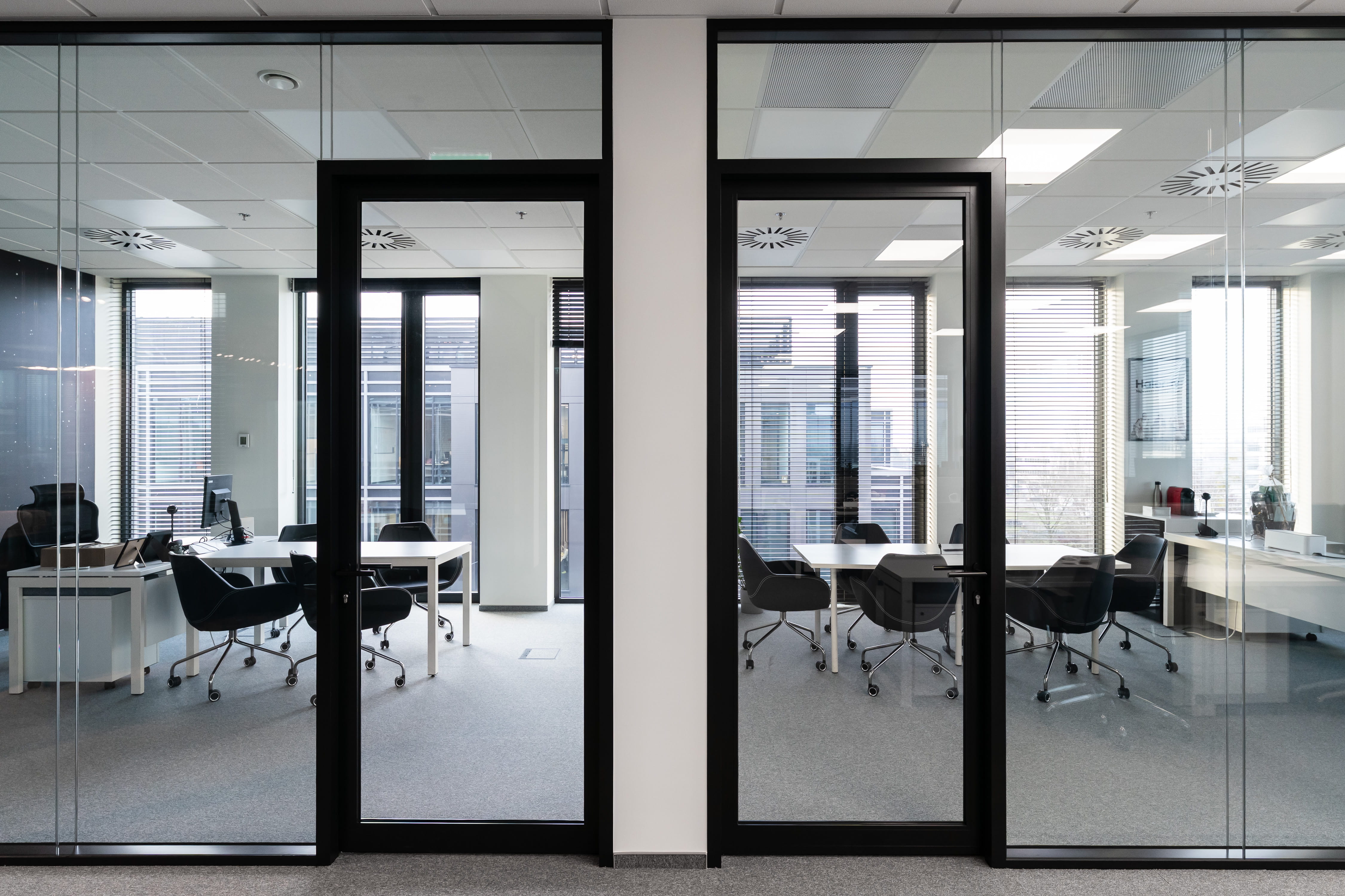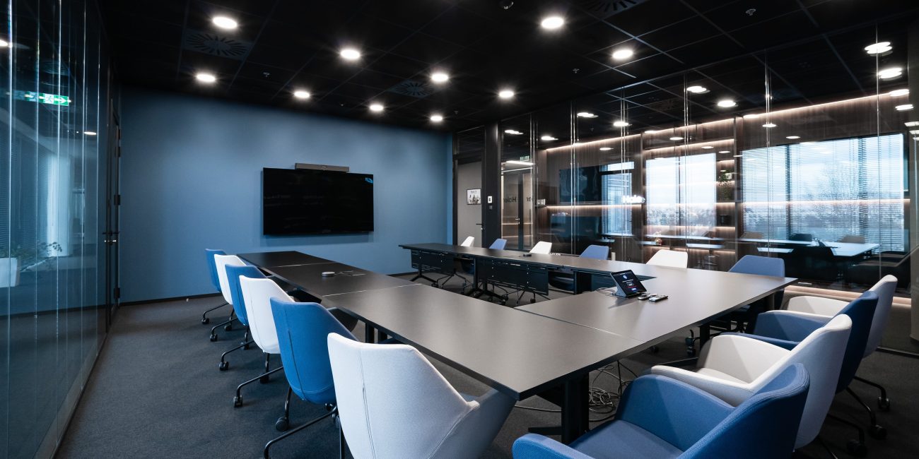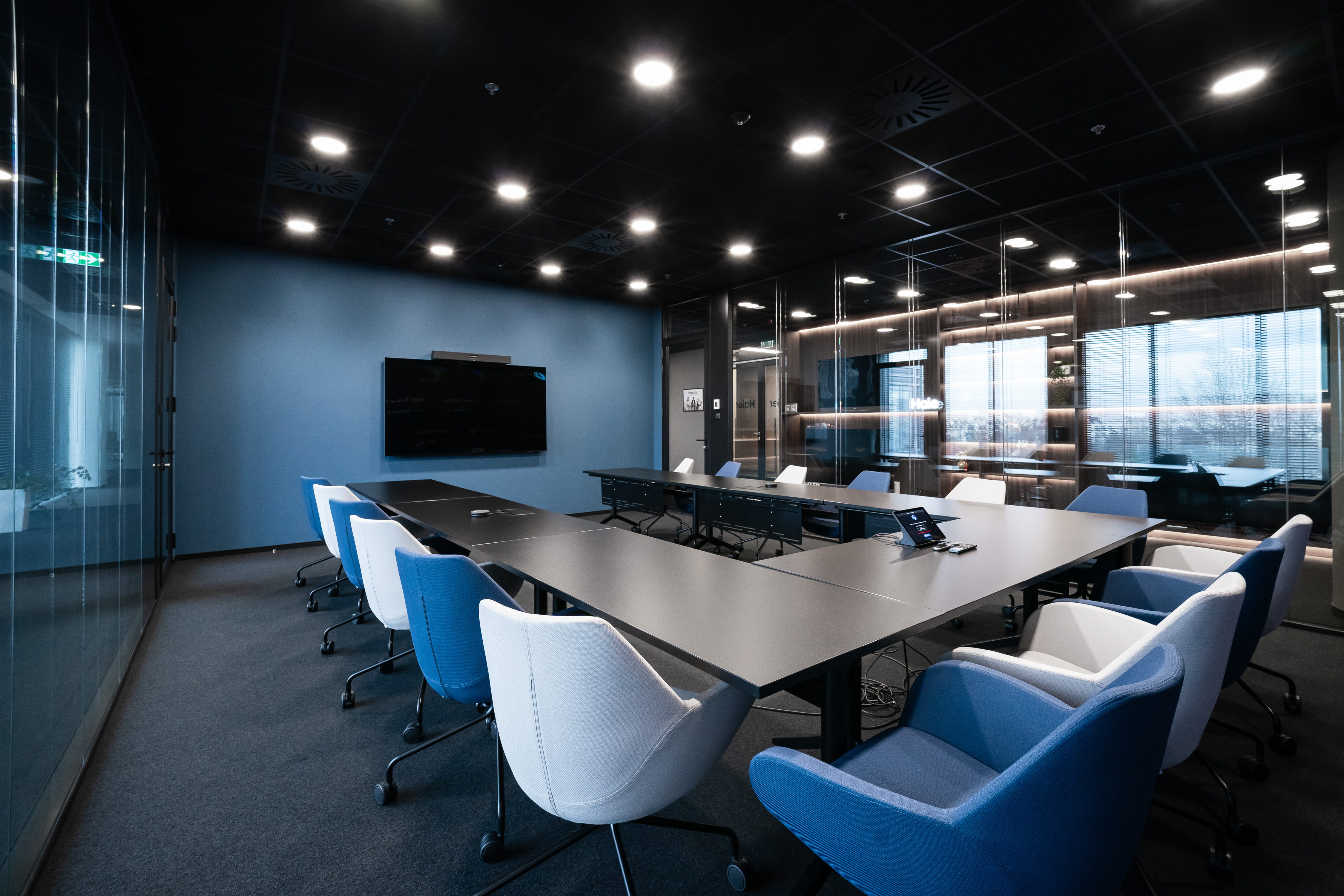 Beyond the showroom, we designed a full office environment: open-plan workspaces, private offices, a generous reception, focus rooms and conference rooms. One of the meeting rooms looks directly onto a multi-storey display of televisions just launching on the Polish market — the effect is striking.