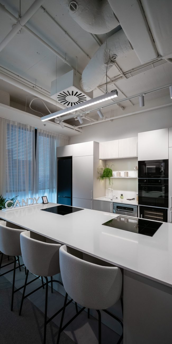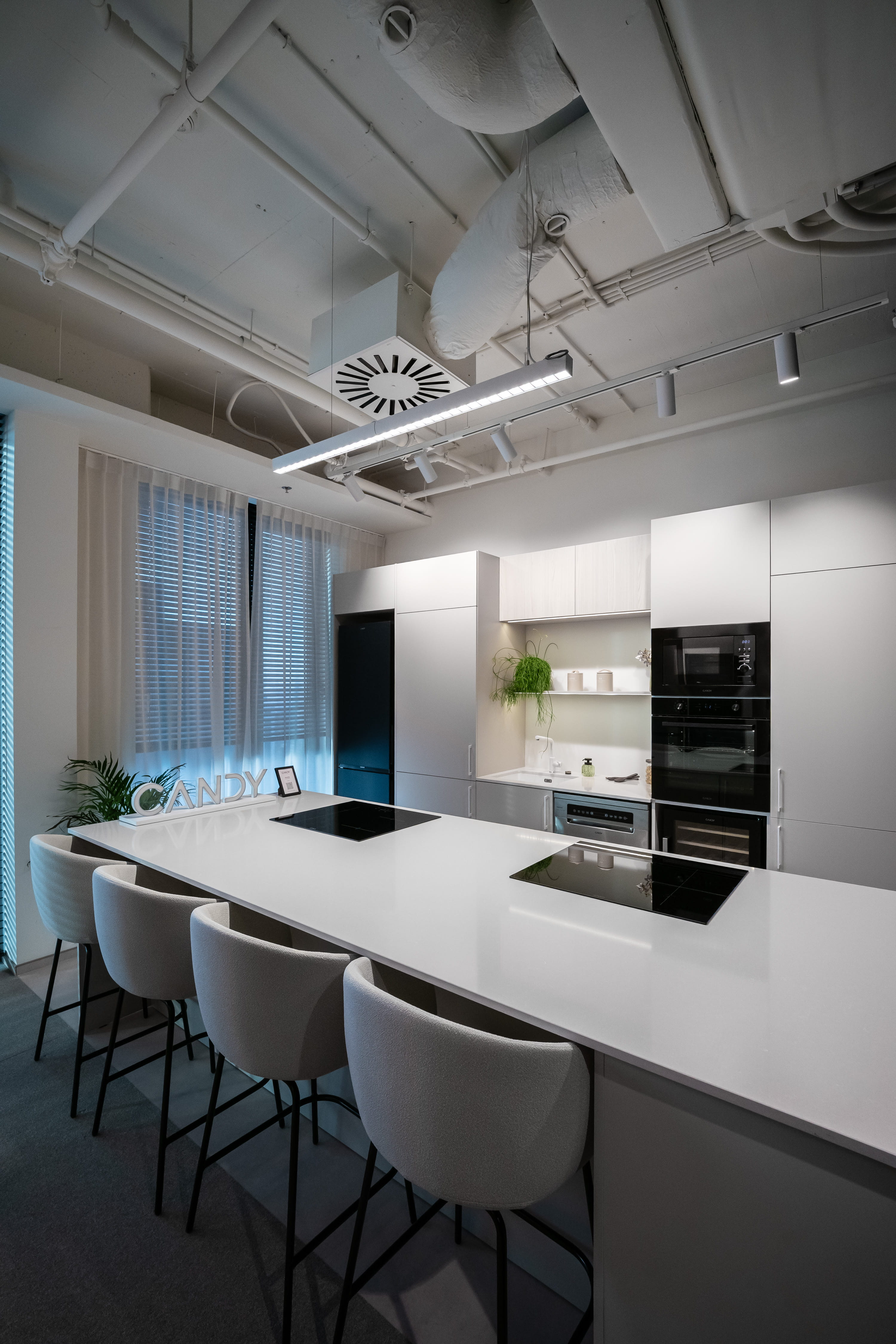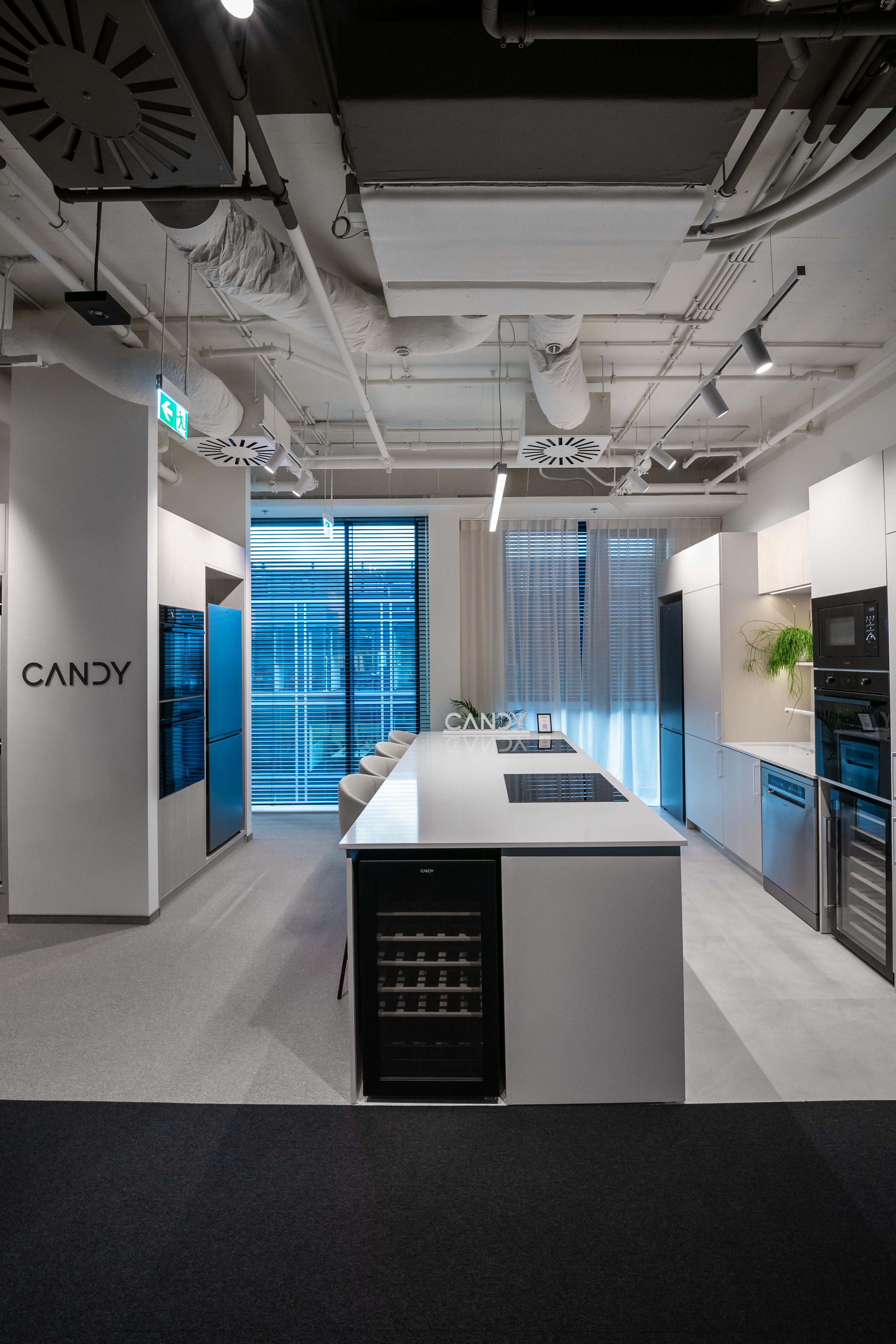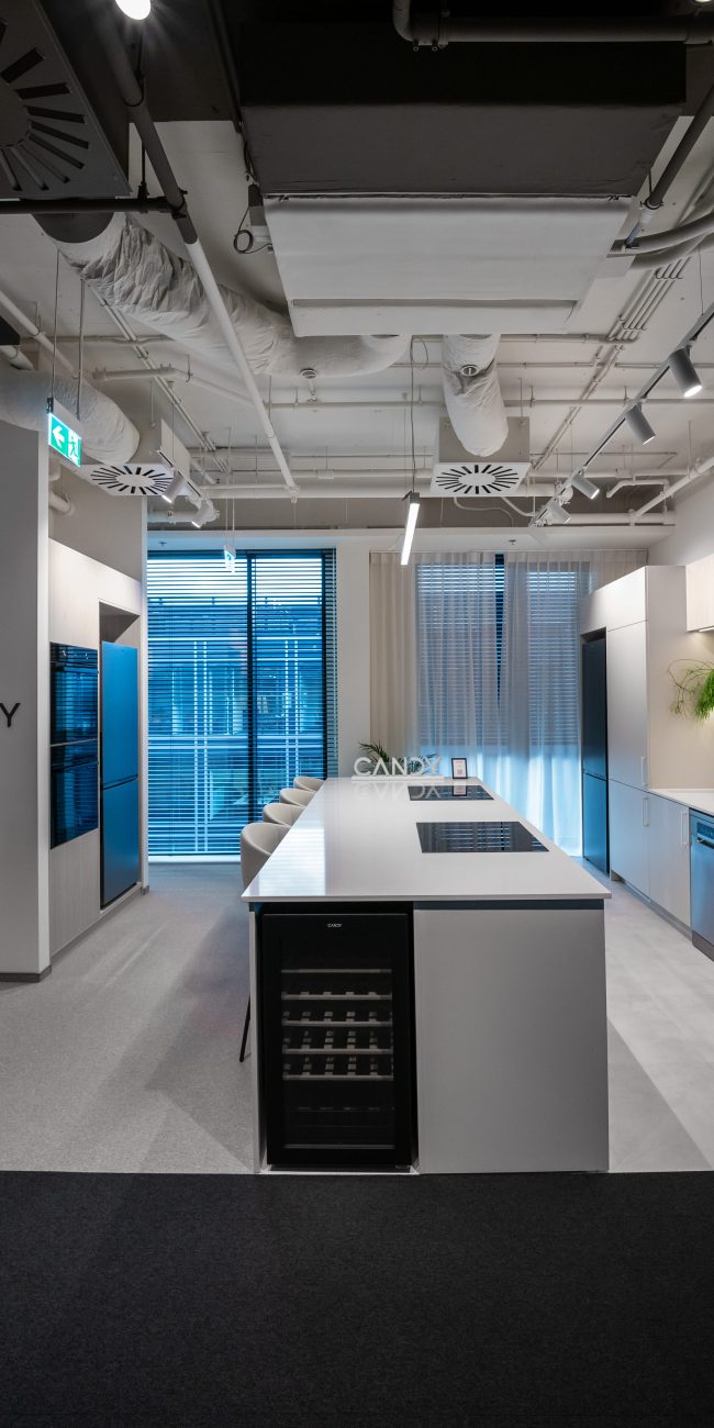 The centrepiece was a showroom designed for two brands — Haier and Candy. That meant creating two adjacent kitchen zones, visually distinct yet forming a coherent whole. And one very concrete challenge: fitting over 70 appliances into clean, well-designed cabinetry.