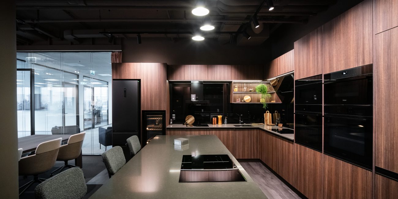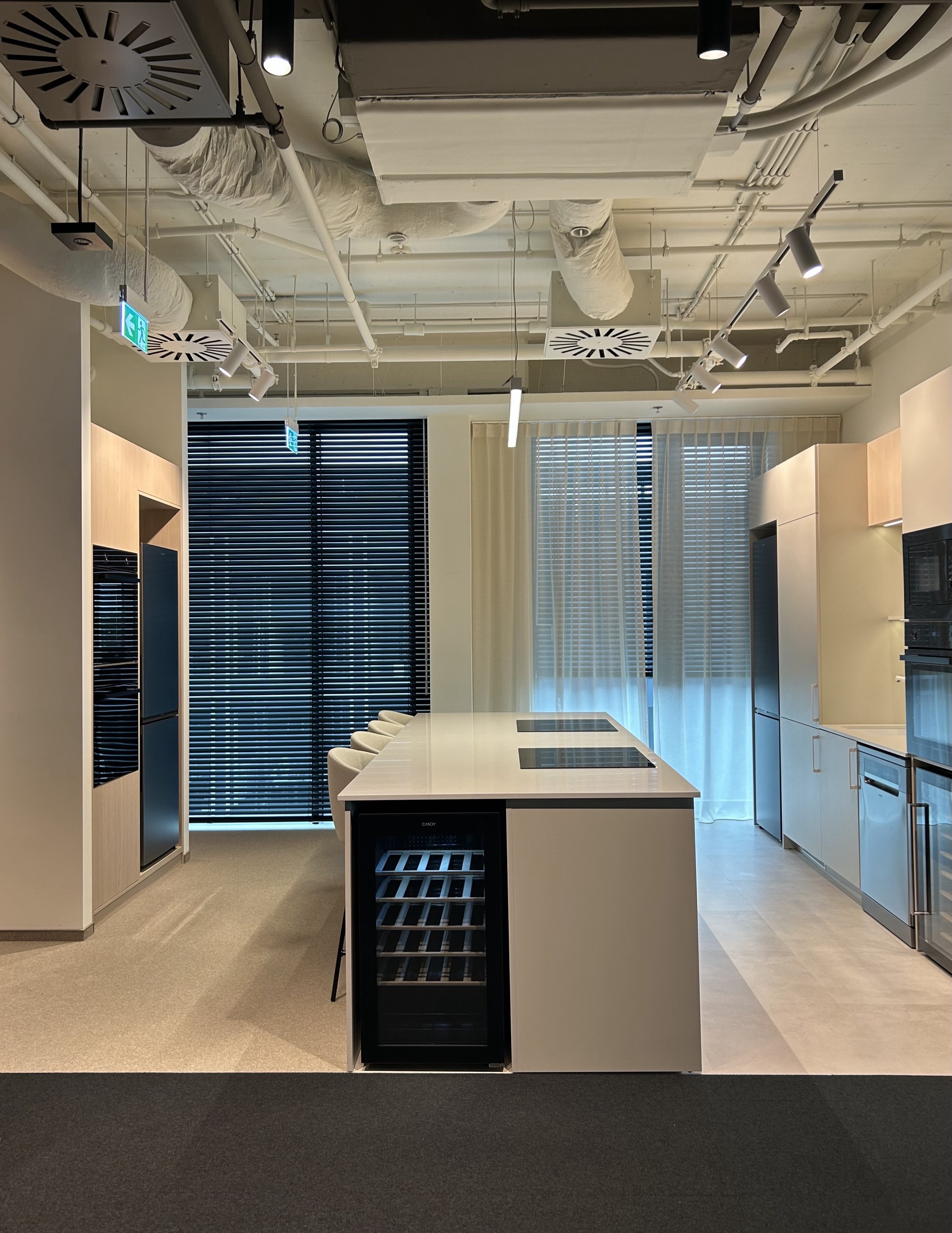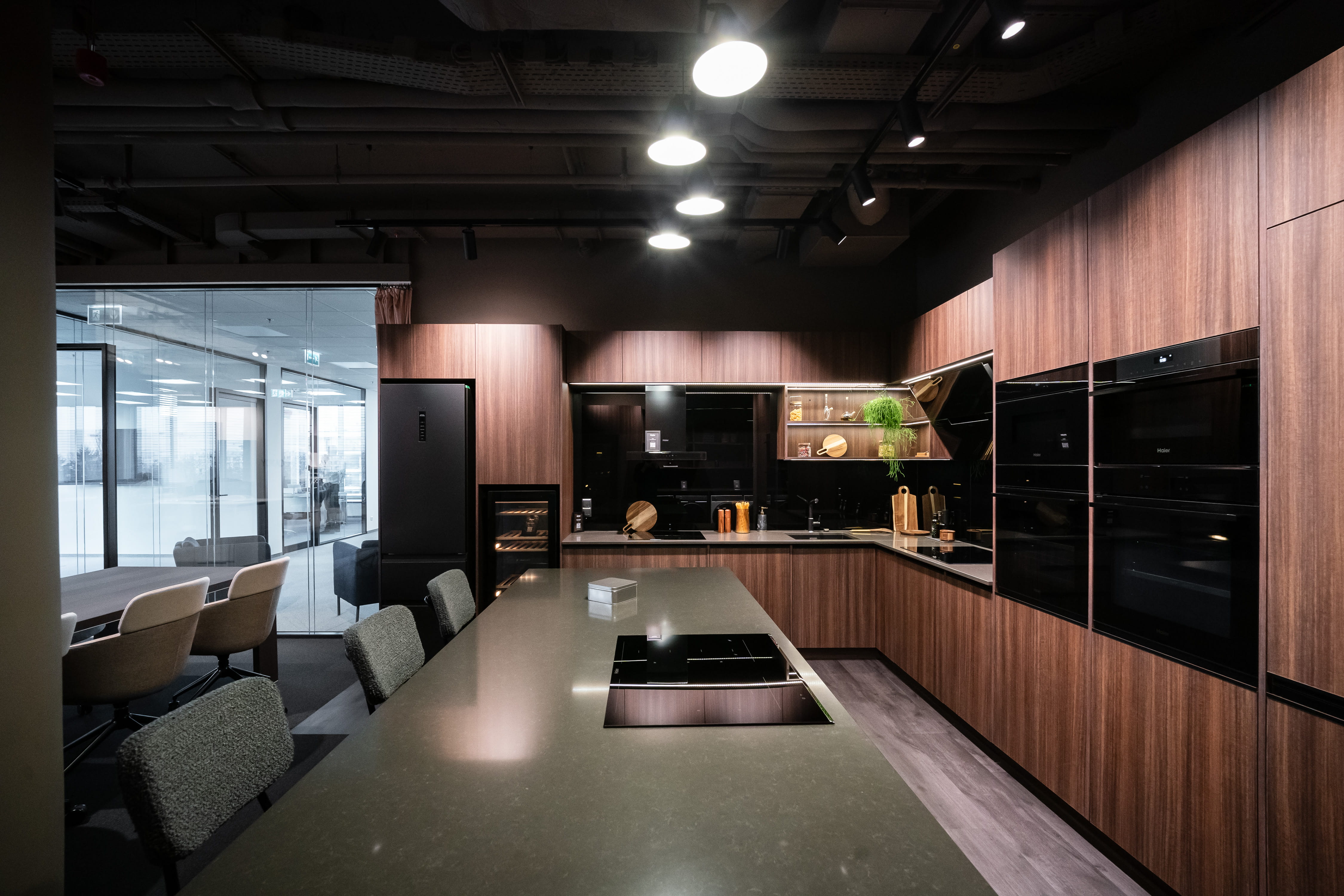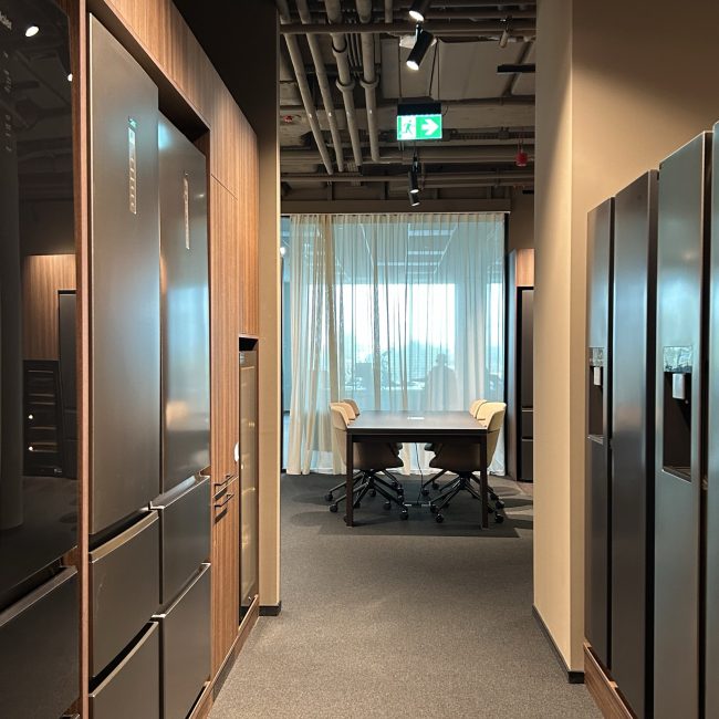 The centrepiece was a showroom designed for two brands — Haier and Candy. That meant creating two adjacent kitchen zones, visually distinct yet forming a coherent whole. And one very concrete challenge: fitting over 70 appliances into clean, well-designed cabinetry.